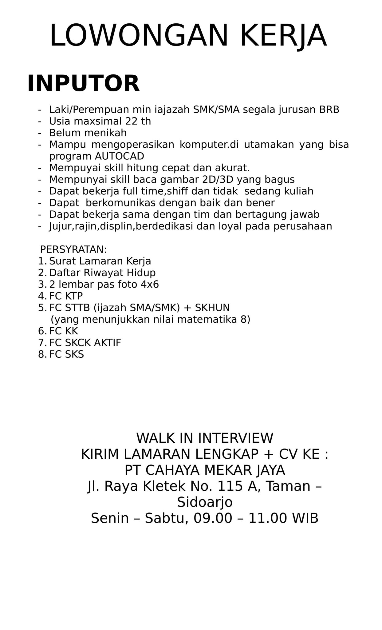 Lowongan Kerja Surabaya Sidoarjo Komunitas Info Loker Facebook from lookaside.fbsbx.com Ratusan iklan lowongan kerja jakarta terbaru untuk lulusan sma, d3, s1, freshgraduate, freelance, part time, full time. Lowongan kerja sd muhammadiyah wedi klaten juni 2021 sd muhammadiyah wedi yang berlokasi di kauman,kalitengah,wedi, membutuhkan segera karya. Informasi lowongan kerja resmi untuk lowongan kerja cpns, bumn, dan multinasional company tahun 2020. Lowongan kerja bank syariah indonesia juni 2021. Lowongan kerja jakarta, bekasi, karawang, dan sekitarnya. Lowongan kerja tahun 2021 lowongan kerja sma smk d3 s1 loker terbaru semua jurusan lowongan bank lowongan bumn lowongan cpns lowongan pekerjaan tahun 2021. Pt mass rapid transit jakarta (pt mrt jakarta) berdiri pada tanggal 17 juni 2008, berbentuk badan hukum perseroan terbatas dengan mayoritas saham dimiliki oleh pemerintah provinsi dki jakarta. Lowongan kerja bank, bumn, cpns dan seluruh perusahaan yang ada di indonesia juni 2021.